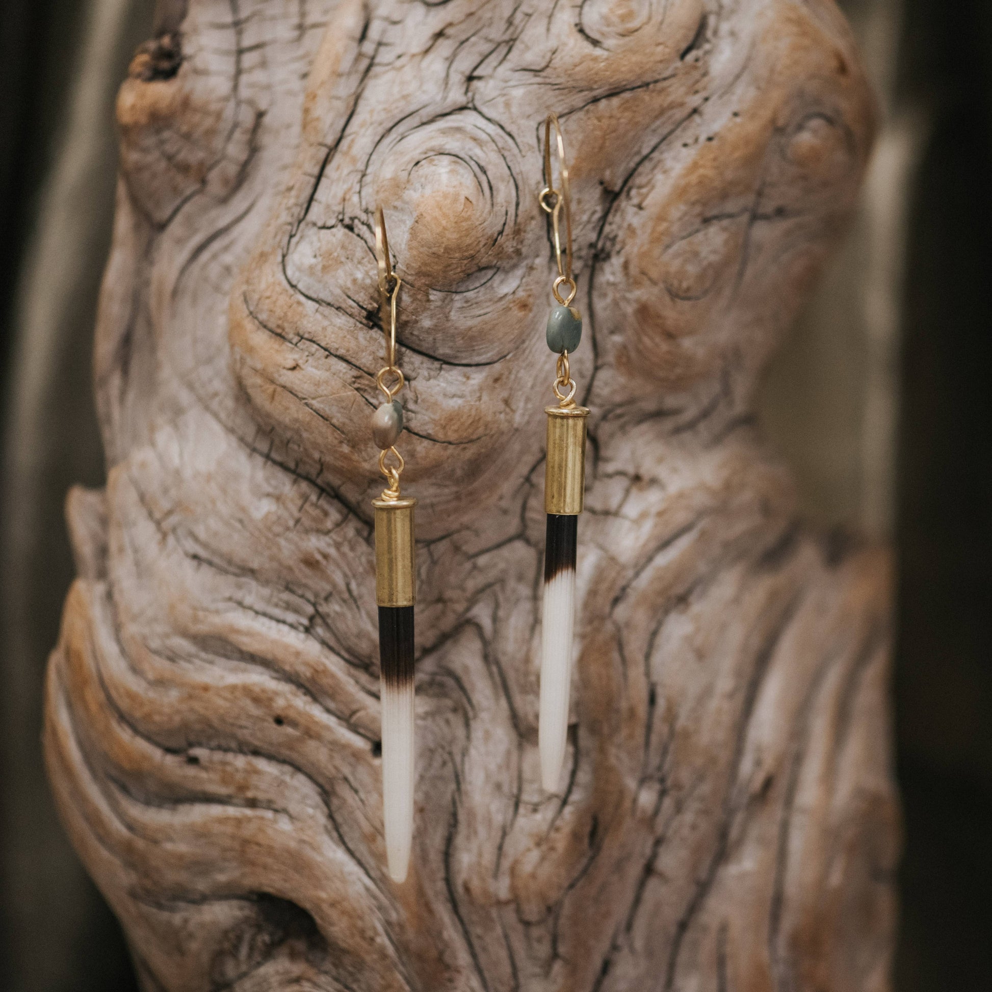 Natural porcupine quills set in .22 bullet casing with American Turquoise on 1" brass hoops. *Quills have been sanded smooth to avoid injury. Quill coloring and length varies (1.5in - 3.5 in). Length is measured from the top of the bullet casing to the bottom of the quill.